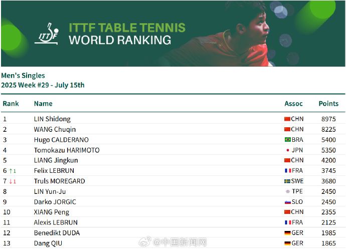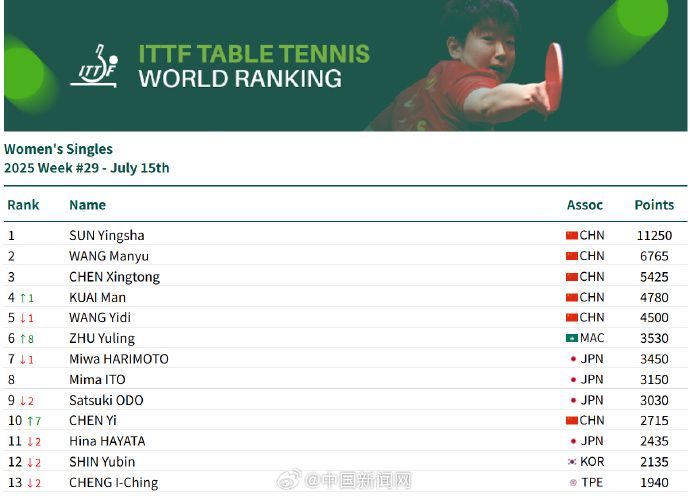 7月15日,世界乒联公布2025年第29周排名。女单方面,孙颖莎11250分保持第一,王曼昱6765分第二, 陈幸同5425分第三,朱雨玲3530分第六,较上周上升8位,陈熠2715分排名第十,较上周上升7位。男单方面,林诗栋8975分保持排名第一,王楚钦 8225分排名第二,雨果5400分排名第三。