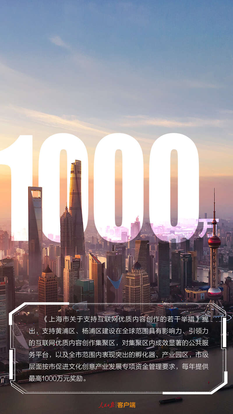 《若干举措》提出,支持黄浦区、杨浦区建设在全球范围具有影响力、引领力的互联网优质内容创作集聚区。对集聚区内成效显著的公共服务平台,以及全市范围内表现突出的孵化器、产业园区,市级层面按市促进文化创意产业发展专项资金管理要求,每年提供最高1000万元奖励。同时,依托平台企业、行业协会,在集聚区内举办全球创作者大会、创新创业大赛等品牌活动,打造行业高端交流交易平台,单个项目按照不超过项目总投资30%的比例,市级层面最高给予200万元资金支持。