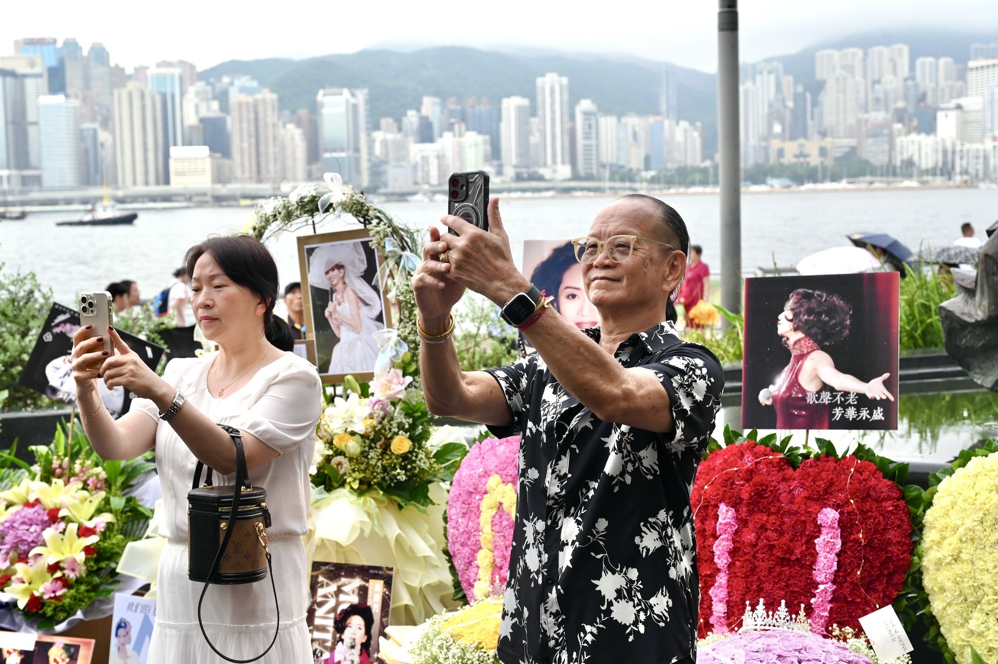 2025年7月18日是香港已故歌星梅艳芳出道43周年的纪念日。当日,有歌迷到位于尖沙咀星光大道的梅艳芳铜像前献花悼念。据了解,在1982年7月18日的首届新秀歌唱大赛决赛中,梅艳芳凭借徐小凤名曲《风的季节》赢得冠军,自此开始演艺生涯。图为大批歌迷在梅艳芳铜像前悼念。 中新社记者 李志华 摄