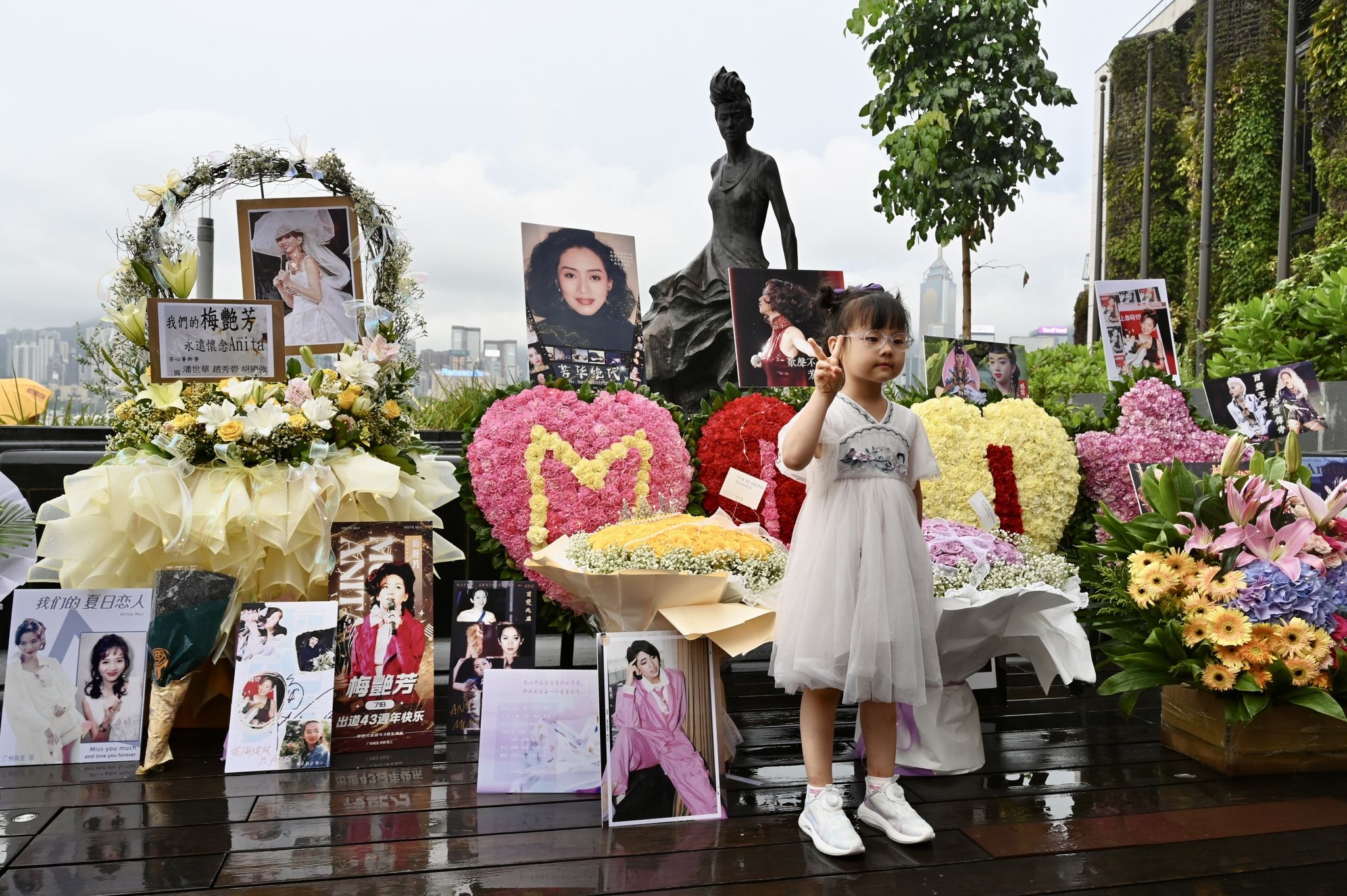 2025年7月18日是香港已故歌星梅艳芳出道43周年的纪念日。当日,有歌迷到位于尖沙咀星光大道的梅艳芳铜像前献花悼念。据了解,在1982年7月18日的首届新秀歌唱大赛决赛中,梅艳芳凭借徐小凤名曲《风的季节》赢得冠军,自此开始演艺生涯。图为一位小女孩与梅艳芳铜像及鲜花合影。 中新社记者 李志华 摄