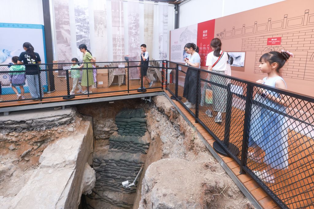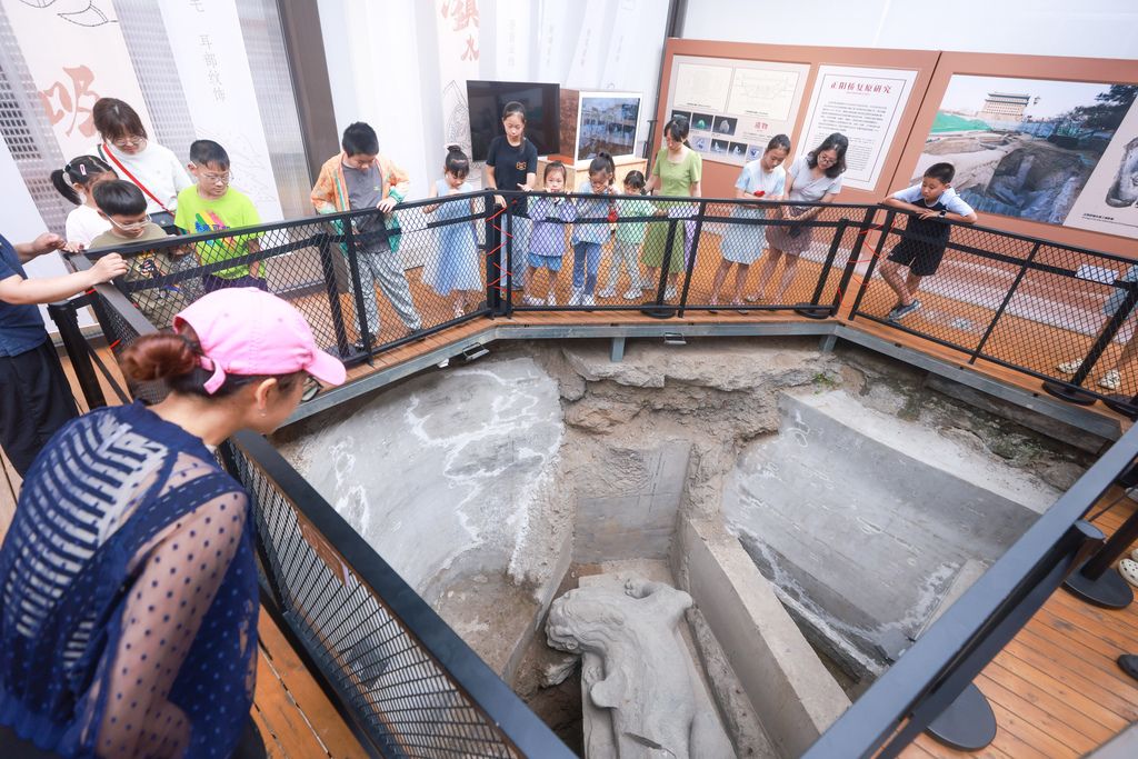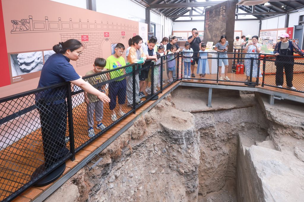 2025年7月20日,位于北京中轴线上的正阳桥遗址考古方舱内,小学生们在听取讲解,学习历史知识。暑假开始后,北京中轴线上各景点的研学热度不断升高。 中新社记者 贾天勇 摄