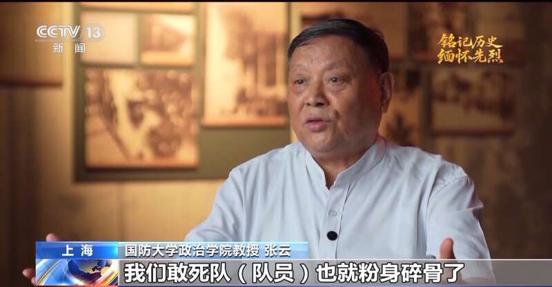 国防大学政治学院教授 张云:中国守军将手榴弹捆在一起,先炸坏日军的装甲车履带,这样埋伏的敢死队队员就在硝烟中冲上装甲车,把炸弹投下去,装甲车爆炸了,我们敢死队队员也就粉身碎骨了。