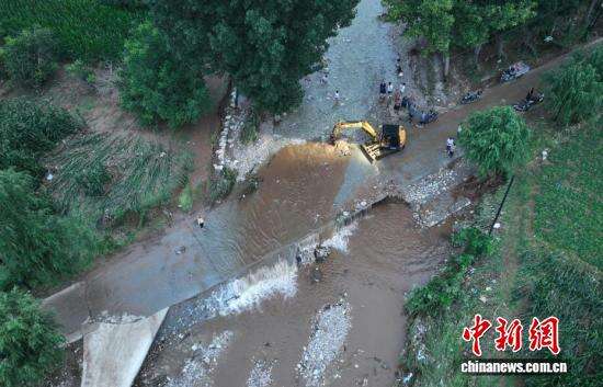 7月25日,航拍河北省保定市易县北淇村道路抢修现场。河北省保定市易县防汛抗旱指挥部办公室25日最新消息,受24日至25日强降雨影响,该县共造成182个村受灾,转移686户1697人,无人员伤亡。目前,抢险救援正在有序进行。(无人机照片)