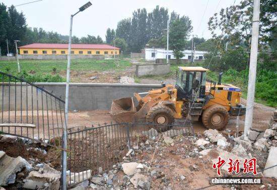 河北省保定市易县北淇村工程车辆正在抢修道路。