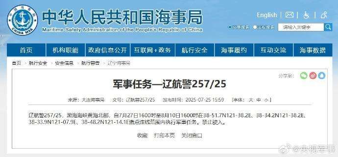据中国海事局网站消息,大连海事局发布航行警告,7月27日16时至8月10日16时,渤海海峡黄海北部部分海域执行军事任务,禁止驶入。