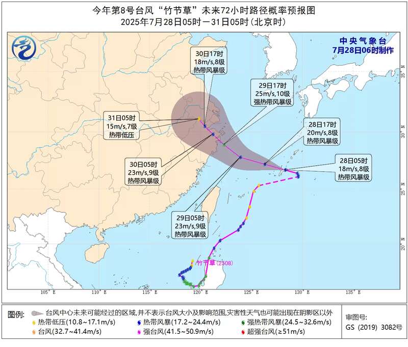 中央气象台7月28日6时发布台风蓝色预警:今年第8号台风“竹节草”减弱后的低压环流昨天(27日)晚上在琉球群岛以东洋面再度发展为台风(该续编台风中央气象台将继续维持原台风名称“竹节草”和编号2508不变),今天早上5点钟其中心位于浙江省舟山市东偏南方向约700公里的琉球群岛以东洋面上,就是北纬26.7度、东经128.3度,中心附近最大风力有8级(18米/秒),中心最低气压为992百帕,七级风圈半径200-300公里预计,“竹节草”将以每小时15-20公里的速度向西偏北方向移动,强度缓慢增强,即将进入东海东部海面,并向浙江北部到江苏南部一带沿海靠近。