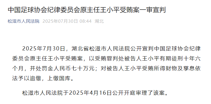 2025年7月30日,湖北省松滋市人民法院公开宣判中国足球协会纪律委员会原主任王小平受贿案,以受贿罪判处被告人王小平有期徒刑十年六个月,并处罚金人民币七十万元;对被告人王小平受贿所得财物及孳息依法予以追缴,上缴国库。