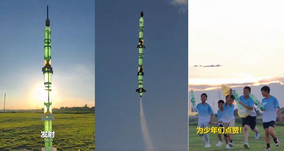 孩子们暑期自制的三级水火箭成功发射!夕阳作伴,“火箭”冲天,这一刻太燃,也太美!为少年们点赞!