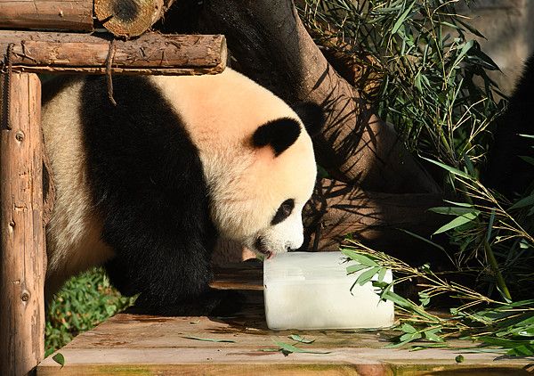 2025年8月5日,重庆动物园大熊猫吃冰砖享受清凉。当日,重庆市气象台发布“高温红色预警信号”,预计部分区县日最高气温将升至40-42摄氏度。