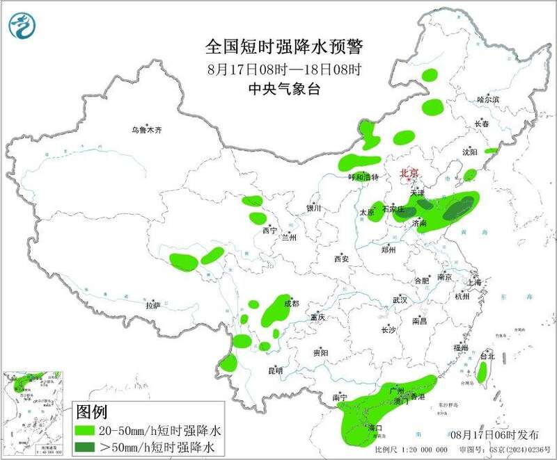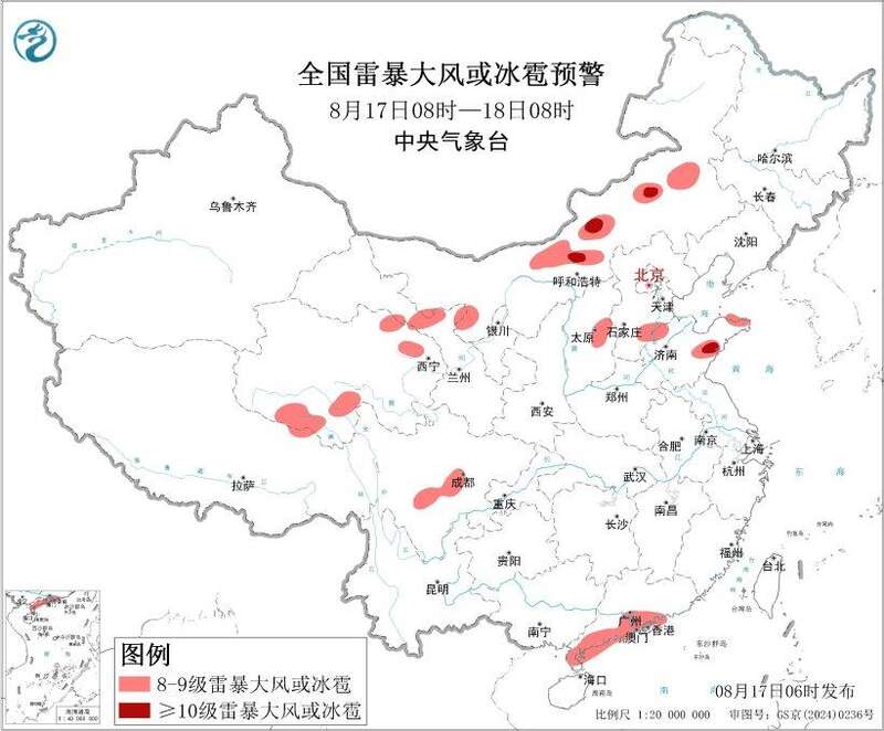 预计8月17日08时至18日08时,内蒙古中东部、西北地区中部、华北中南部、黄淮北部、西南地区北部、华南南部等地的部分地区将有8级以上雷暴大风或冰雹天气,其中,内蒙古中部、山东中东部等地的部分地区将有10级以上雷暴大风;内蒙古中部和东部、西北地区中部、华北中南部、黄淮北部、西南地区北部、华南南部等地的部分地区将有小时雨量大于20毫米的短时强降水天气,其中,河北南部、山东北部和东部等地的部分地区小时雨量大于50毫米,最大可达70毫米以上。