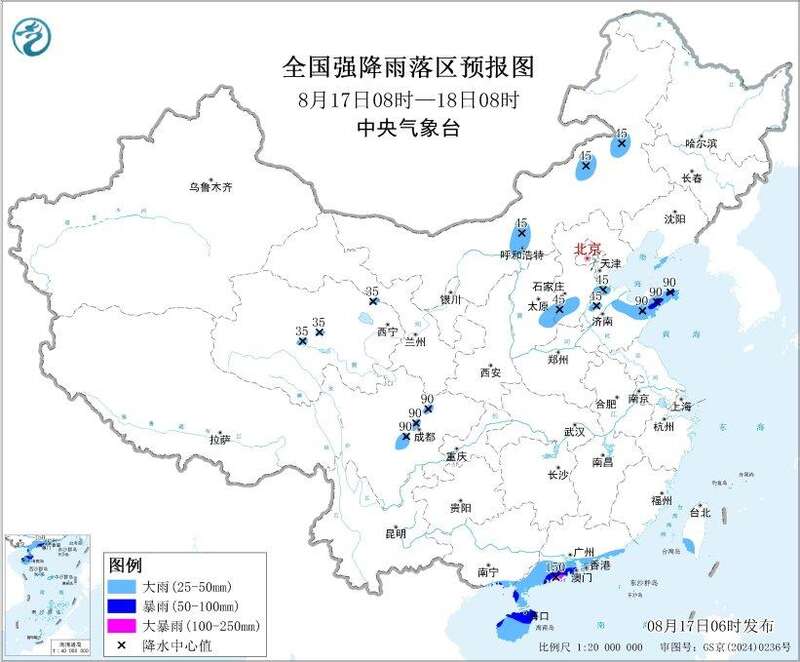 预计,8月17日08时至18日08时,内蒙古中东部、山西东南部、河北南部、山东中北部、青海中北部、四川盆地西部、广西东南部沿海、广东南部沿海、海南岛、台湾岛南部等地部分地区有大到暴雨,其中,广东西南部沿海等地局地有大暴雨(100~150毫米)。上述部分地区伴有短时强降水(最大小时降雨量20~50毫米,局地可超过70毫米),局地有雷暴大风等强对流天气。