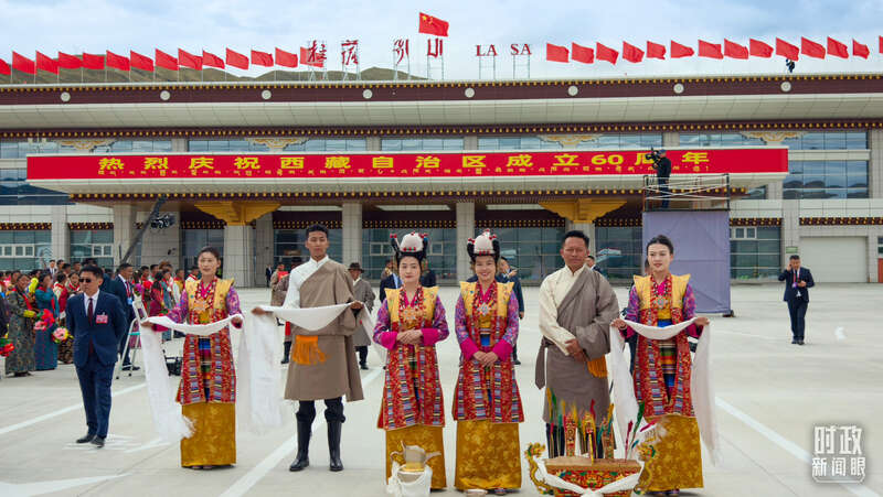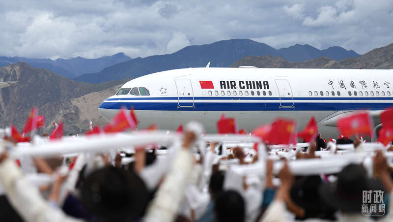 拉萨贡嘎机场红旗飘扬,鼓乐喧天,气氛热烈。20日中午,总书记乘坐的专机在贡嘎机场降落,等候在停机坪的西藏各族各界群众热烈欢呼。