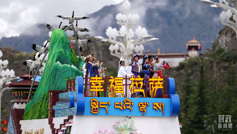 在“奋进新时代”单元中,西藏7个地市的游行方队和彩车独具风格,是生动展现地方特色的窗口。例如,“幸福拉萨”彩车的雪莲花、“开放的日喀则”彩车的云端哨所、“藏源山南”彩车的雅鲁藏布江、“醉美林芝”彩车的桃花、“红色昌都”彩车的西藏解放第一村、“极地那曲”彩车的藏羚羊、“天上阿里”彩车的冈底斯山脉等。
