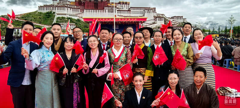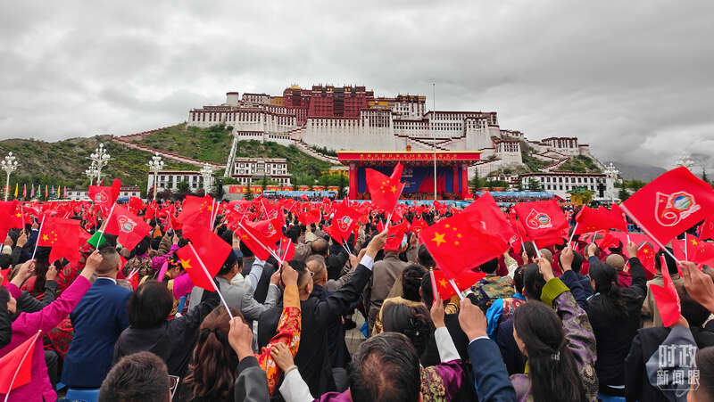 庆祝大会的会场设置在雄伟的布达拉宫前,位于群山环抱之中。大会主席台采用藏式风格。约2万人欢聚布达拉宫广场,红、黄、白、蓝等体现藏族文化基因的色彩铺满眼前,烘托出吉祥喜庆的浓烈氛围。