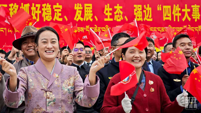 在庆祝大会的群众游行环节,“四件大事”单元展示了西藏自治区“四个创建”的奋斗目标:着力创建全国民族团结进步模范区、着力创建高原经济高质量发展先行区、着力创建国家生态文明高地、着力创建国家固边兴边富民行动示范区,分别对应稳定、发展、生态、强边四件大事。