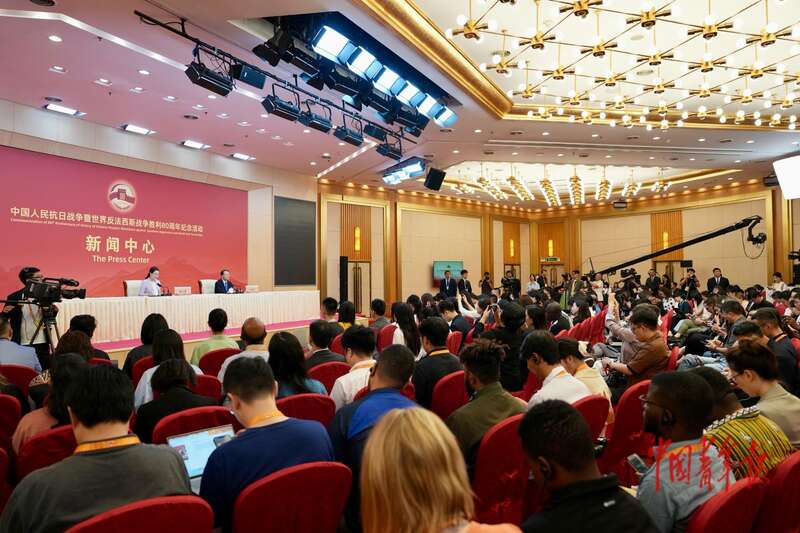 8月29日上午,中国人民抗日战争暨世界反法西斯战争胜利80周年纪念活动新闻中心举办第二场记者招待会,吸引了众多媒体的关注。中青报·中青网记者 李隽辉/摄