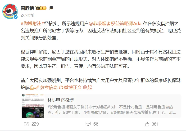 据微博社区观察员官方账号@围脖侠30日消息,经核实,所示违规用户 @非吸烟者权益策略师Ada 存在多次借控烟之名违规推广所谓尼古丁袋等行为,因违反法律法规和社区公约的有关规定,现已受到关闭账号的处置。