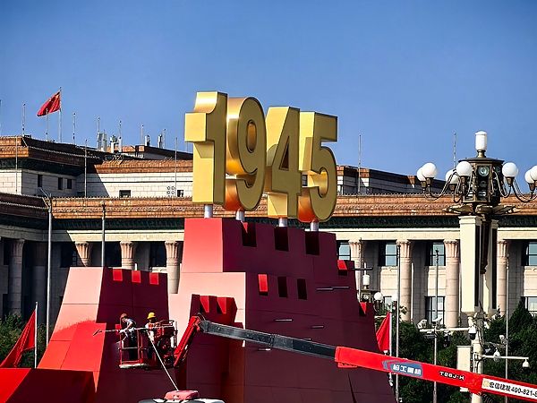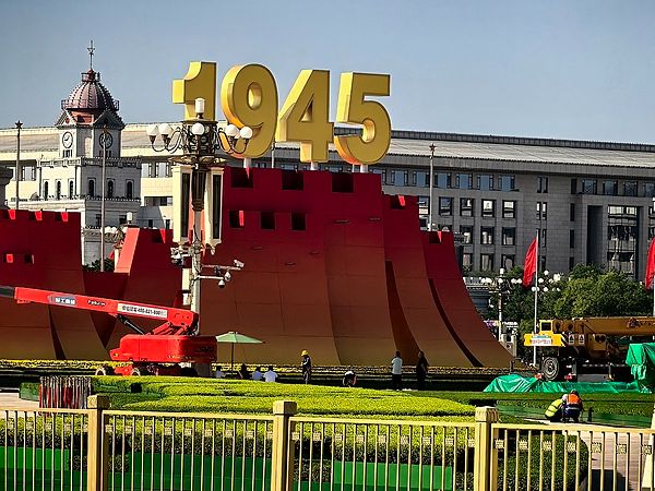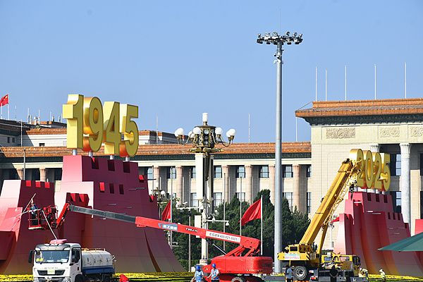 2025年8月31日,北京,天安门广场布置年号台、观众席、LED大屏等要素,长安街沿线布置10组立体花坛。