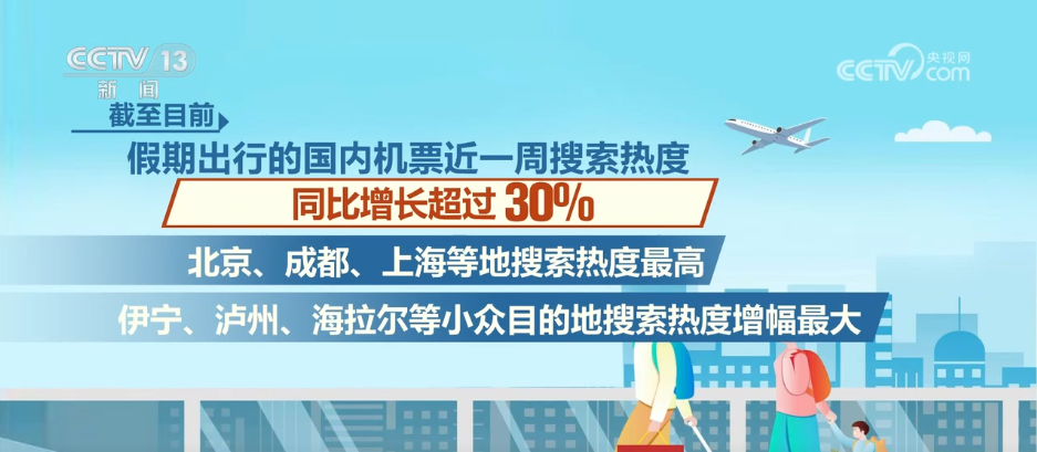 9月以来,中秋和国庆假期的出行搜索量增幅同比2024年有较大幅度提升。截至目前,假期出行的国内机票近一周搜索热度同比增长超过30%。其中,北京、成都、上海等地搜索热度最高;伊宁、泸州、海拉尔等小众目的地搜索热度增幅最大,同比超过60%。