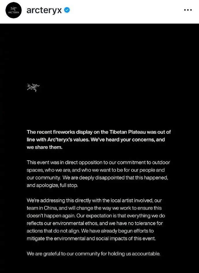 9月19日,户外品牌始祖鸟联手艺术家蔡国强在喜马拉雅山放烟火,引发争议。21日,始祖鸟在社交平台发布致歉信。
