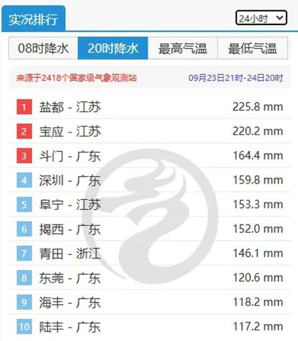9月23日20时至24日20时,盐城(盐都)225.8毫米、宝应220.2毫米均打破当地观测史单日降水量纪录。