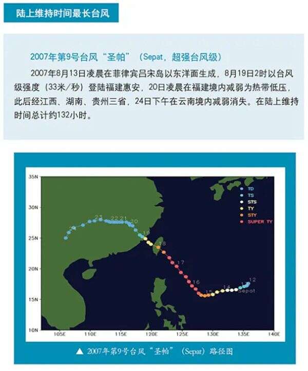 历史数据来看,2007年9号台风“圣帕”登陆上岸后的陆上“存活”时间最长,在陆上维持时间总计约132小时,也就不到6天。
