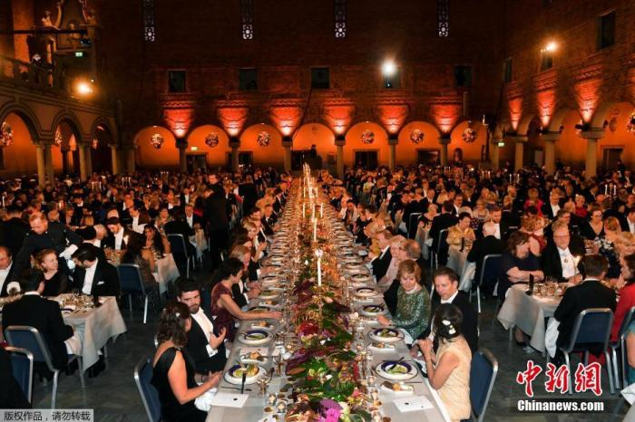 资料图:当地时间2018年12月10日,瑞典斯德哥尔摩,诺贝尔奖晚宴举行,诺贝尔奖得主、瑞典王室成员与众多名流出席。