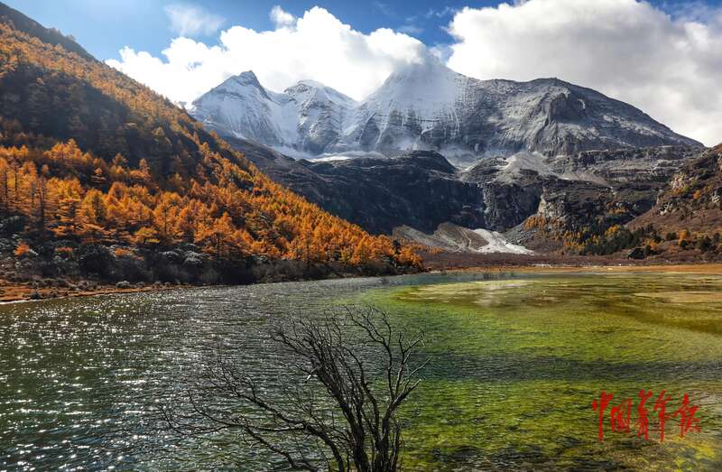 10月29日,四川省甘孜藏族自治州,稻城亚丁风景区,雪山与金色的树叶在贡嘎措的映衬下格外壮观。中青报·中青网记者 李建泉/摄