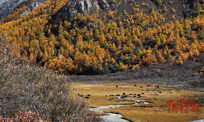 10月29日,四川省甘孜藏族自治州,稻城亚丁风景区,洛绒牛场被三座神山环绕,贡嘎河从藏民放牧的牛场穿过,周围是连绵的高山草甸。在四川省甘孜藏族自治州建州75年之际,记者走进稻城亚丁,用镜头定格当地独特的自然生态之美。稻城亚丁的三神山由仙乃日、央迈勇、夏诺多吉组成,是藏民心中的朝圣之地,也是国家级自然保护区、四川省级风景名胜区和世界生物圈保护区。当下稻城亚丁秋意正浓,金黄的树叶布满山谷,让人仿佛置身世外桃源。中青报·中青网记者 李建泉/摄