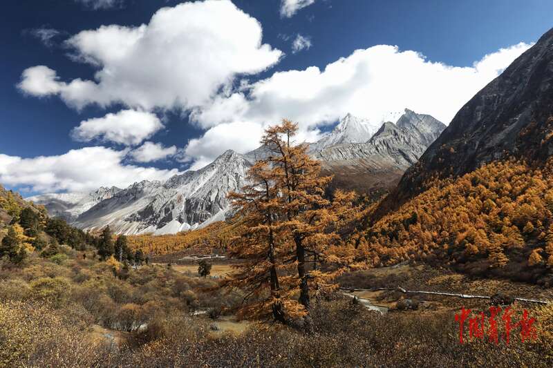 10月29日,四川省甘孜藏族自治州,稻城亚丁风景区,秋日的雪山与山谷里的金色树叶。中青报·中青网记者 李建泉/摄