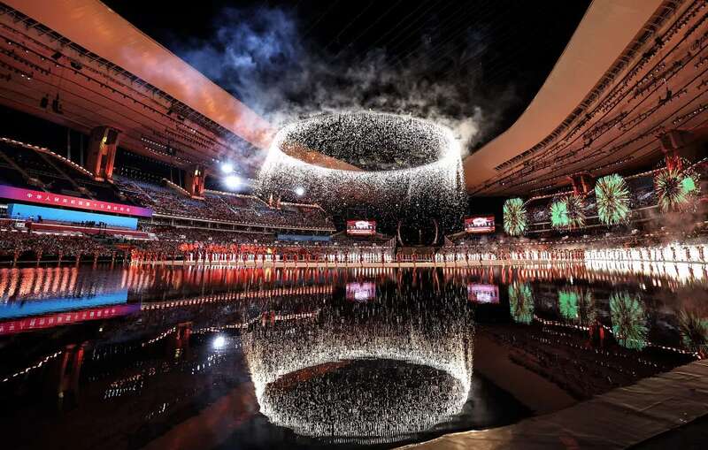 这是11月9日在开幕式现场拍摄的中华人民共和国国旗(中)、中华人民共和国运动会会旗(左)和第十五届全国运动会会旗。新华社记者 邓华 摄