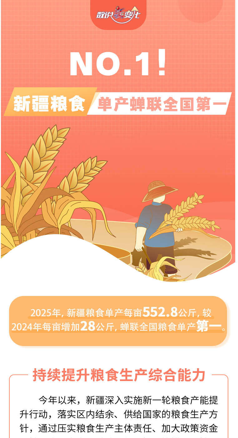 近日,国家统计局发布2025年粮食产量数据,其中新疆粮食单产每亩552.8公斤,蝉联全国粮食单产第一。这一成就是如何取得的?新疆做了哪些努力?今天的《数说“新”变化》一起来看看。