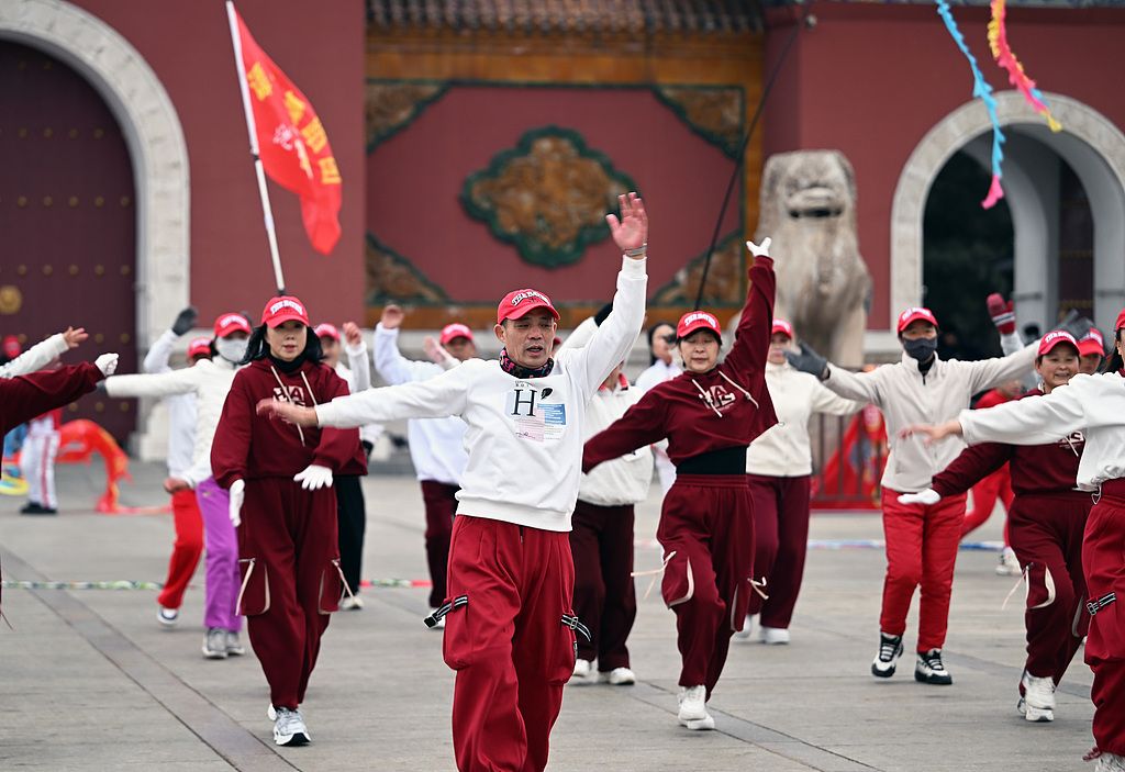 2025年12月19日,辽宁沈阳,北陵公园门前广场,八支群众体育队伍以舞龙、舞狮、街舞等表演迎接2026新年。