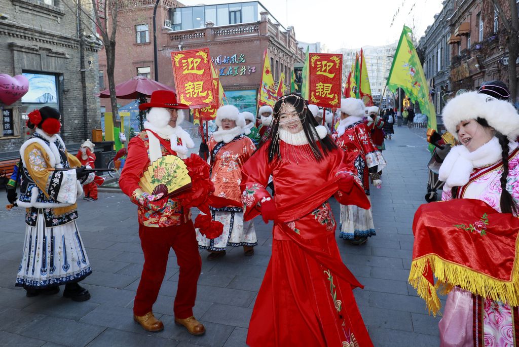 2026年1月10日,黑龙江省哈尔滨市,道外区的中华巴洛克历史文化街区被"龙江冰雪游"的巡游活动点燃。传统接亲仪式中,花轿伴着唢呐声缓缓前行,新郎官身着红袍向观众作揖,新娘盖头下露出羞涩笑容。成亲仪式上,司仪高声唱礼,新人共饮交杯酒,引来游客阵阵喝彩。