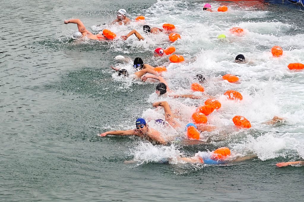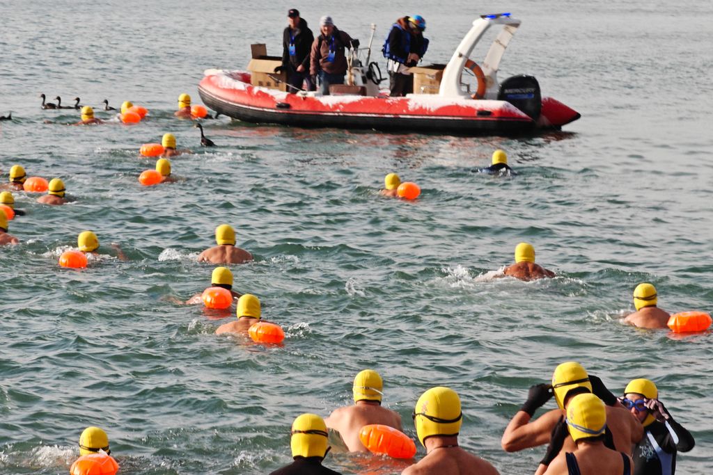 2026年1月11日,辽宁大连,冬泳参赛选手在星海湾100米海上公开水域奋力拼搏。