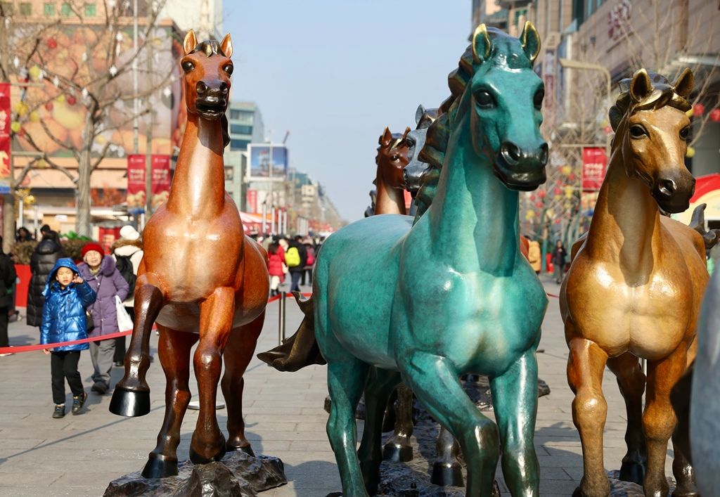2026年1月29日,在北京王府井大街上,中国工艺美术大师朱炳仁的作品《王府八骏》吸引游人驻足观赏。马年将至,北京一些与马相关的艺术装置纷纷亮相,尽显年味。 中新社记者 易海菲 摄