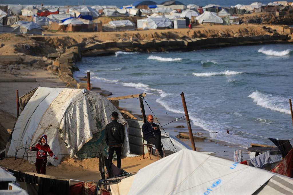 当地时间2026年1月30日,加沙地带南部汗尤尼斯马瓦西地区,人们站在帐篷附近,这里安置着流离失所的巴勒斯坦人。由美国斡旋的停火协议旨在阻止以色列和哈马斯因2023年10月袭击而引发的冲突,该协议已生效三个多月,尽管双方都指责对方一再违反协议。