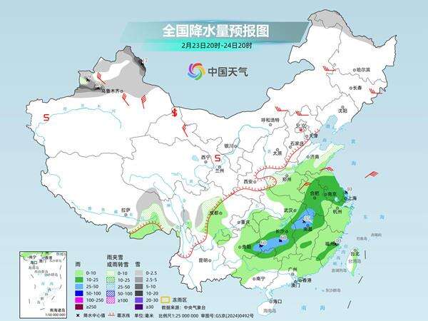 24日,降雨减弱南压,黄淮到江南北部降水暂歇,但江南南部和东部、华南等地还有小雨。