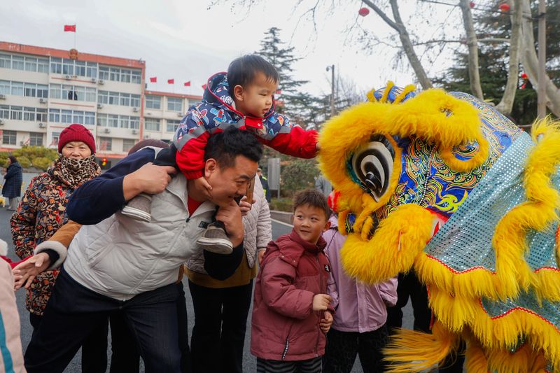2026年2月24日,山东枣庄,农历正月初八,山东省枣庄市山亭区举办丰富多彩的民俗展演活动,贺新春迎元宵。活动中,市民与舞狮互动,民间艺人表演了抬花轿、竹马、舞狮等传统民俗节目。