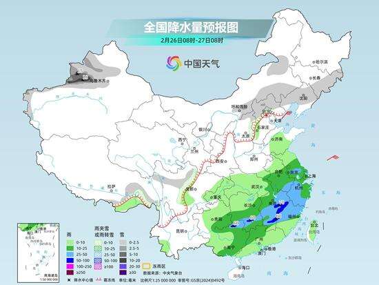 昨天,江南、华南等地雨水持续,局地出现弱雷暴,夜间起降水明显减弱。监测显示,24日8时至25日6时,新疆北部、黑龙江西北部、西藏东部等地部分地区出现小到中雪或雨夹雪,局地大雪;湖南东南部、广西东北部、福建南部等地部分地区出现中雨,局地大雨。