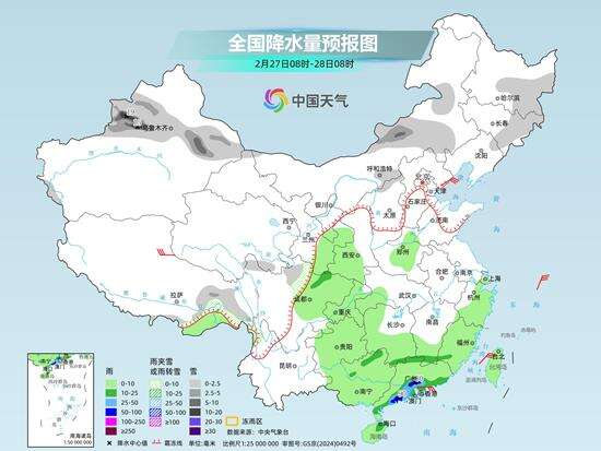 今天至27日,中东部新一轮大范围降水过程又将上线。北方不少地方还能见到雪花,南方则是阴雨频繁。根据中央气象台预报,今天,内蒙古东北部、黑龙江中北部、新疆沿天山地区和伊犁河谷、西藏东部、川西高原北部等地部分地区有小雪或雨夹雪,其中,内蒙古东北部、黑龙江西北部、新疆沿天山地区和伊犁河谷等地部分地区有中到大雪,内蒙古东北部、黑龙江西北部等地局地暴雪。西北地区东南部、华北中南部、黄淮大部、江淮大部、江汉、江南、西南地区东部和南部、华南大部等地部分地区有小到中雨,其中,湖北南部、湖南中北部和南部、江西中部、重庆中部、广西东北部等地部分地区有大雨。
