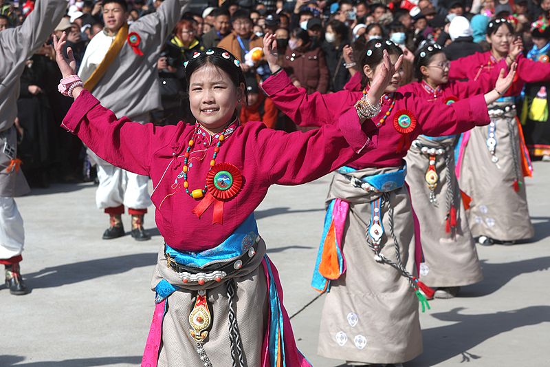 2026年2月26日,民众身着宗喀传统民族服饰跳起舞蹈。当日,第一届拉科德哇宗喀传统民族服饰文艺展演在青海湟中举行,1200余名民众与非遗代表性传承人参与其中。 中新社记者 张忠苹 摄
