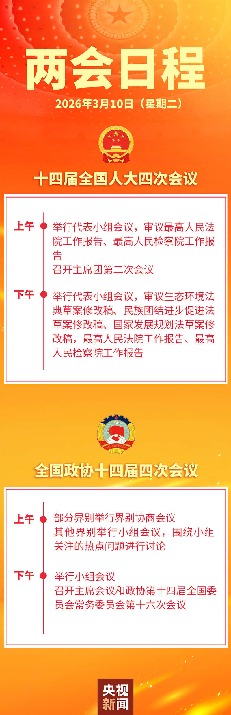 十四届全国人大四次会议10日上午举行代表小组会议,审议最高人民法院工作报告、最高人民检察院工作报告;召开主席团第二次会议。
