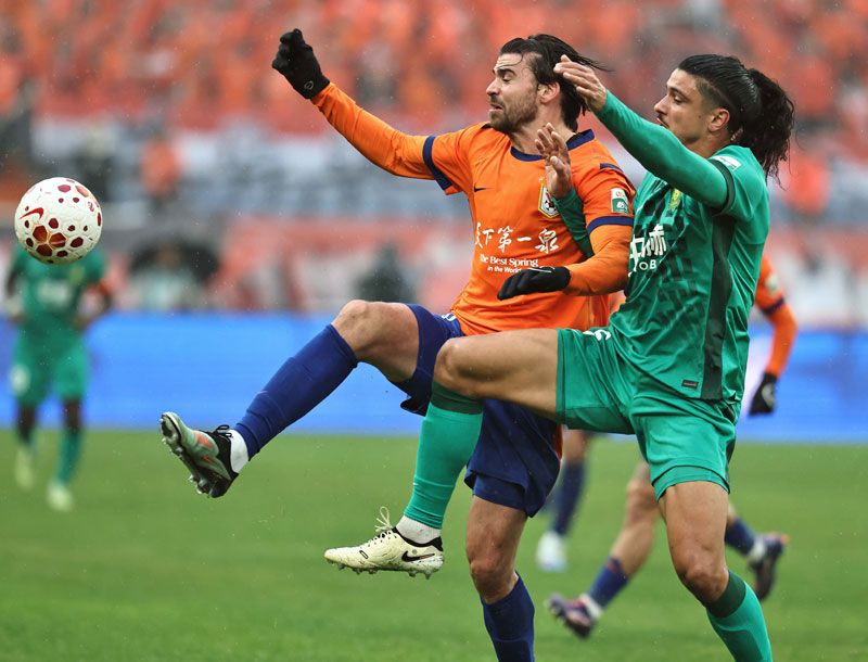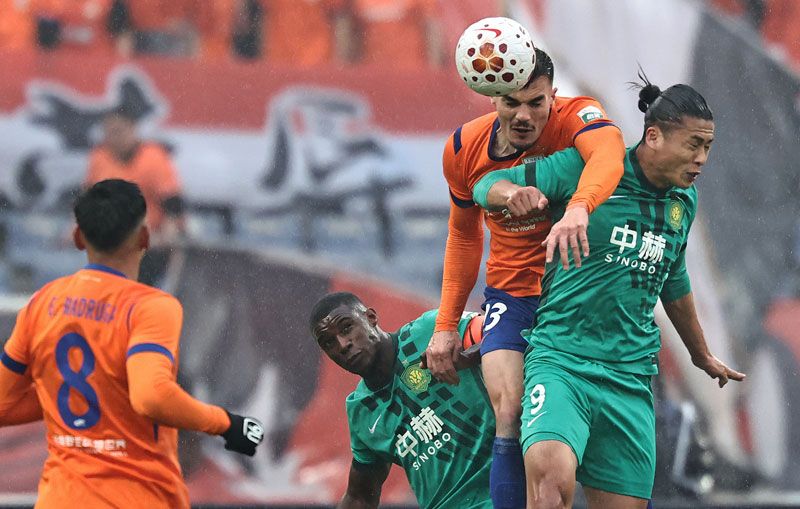 北京国安队11号林良铭(左一)、29号法比奥(左二)与泰山队队员争顶头球。刘占崑/摄