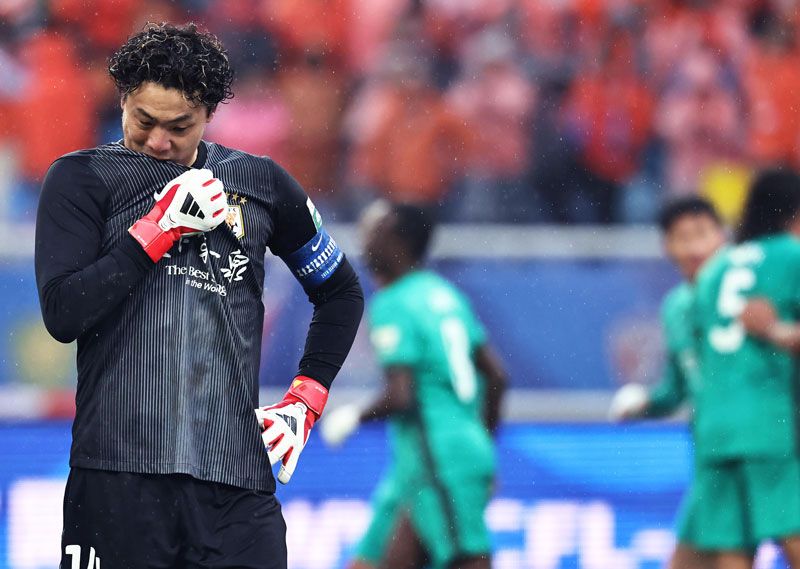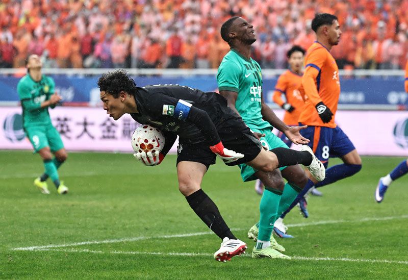 北京国安队扳平比分后,山东泰山队守门员王大雷陷入思考。刘占崑/摄