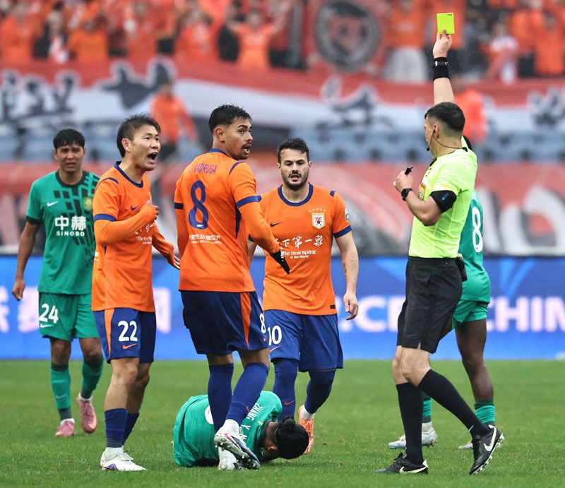 主裁判麦麦提江(右)向泰山队队员出示黄牌。刘占崑/摄