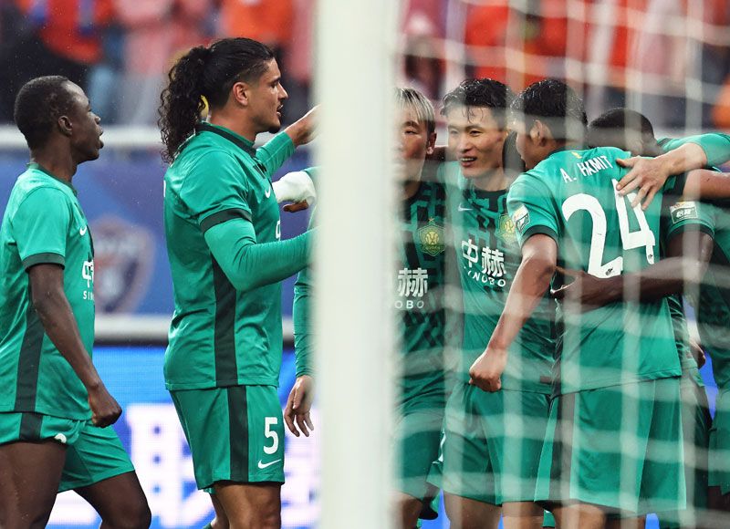 北京国安队队员们庆祝扳平比分。刘占崑/摄