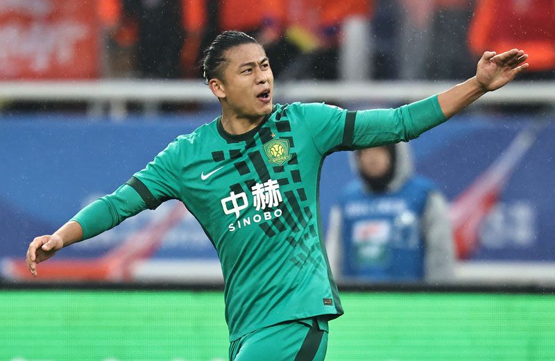 北京国安队9号张玉宁为本队扳平比分后与球迷互动。刘占崑/摄