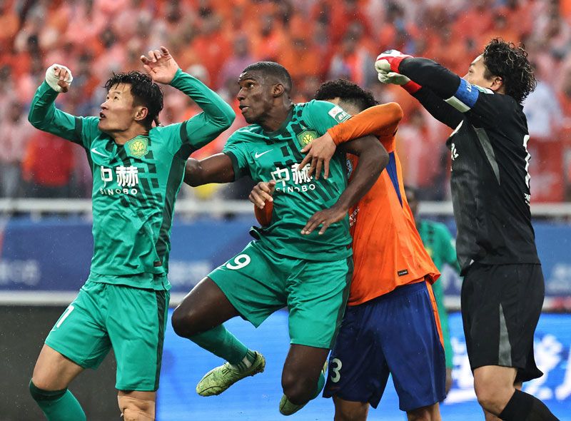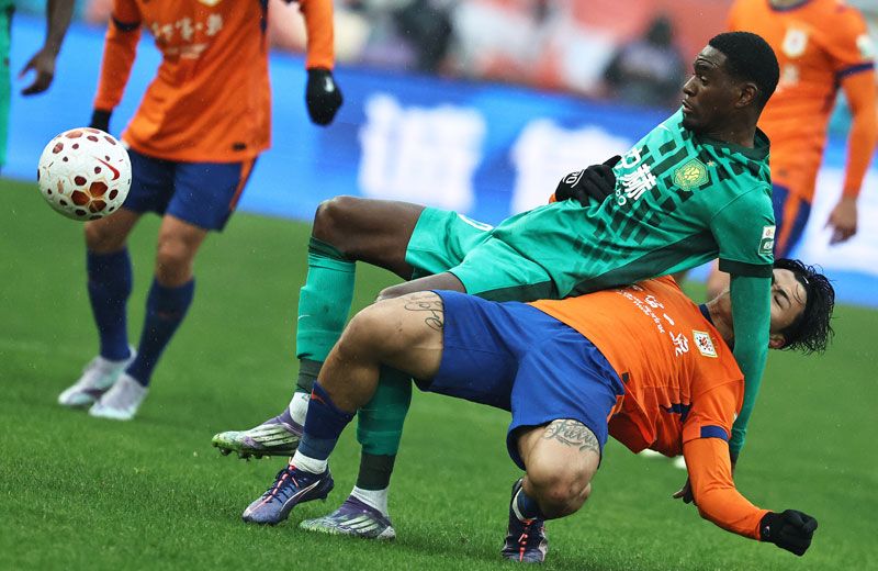 北京国安队20号恩科洛洛(上)与对方球员争抢。刘占崑/摄