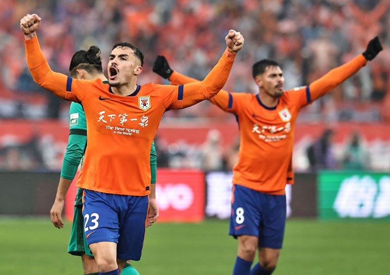 山东泰山队队员庆祝获得比赛胜利。刘占崑/摄